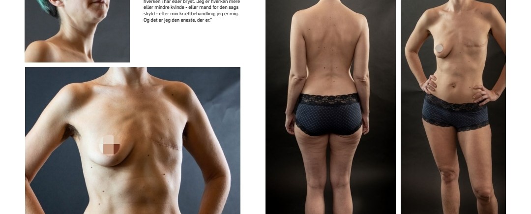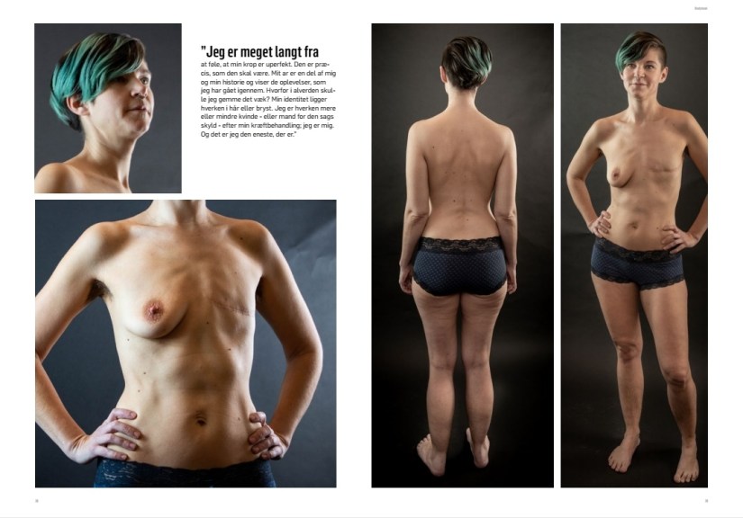 Jeg er meget langt fra at føle, at min krop er uperfekt. Den er præcis, som den skal være. Mit ar er en del af mig og min historie og viser de oplevelser, som jeg har gået igennem. Hvorfor i alverden skulle jeg gemme det væk? Min identitet ligger hverken i hår eller bryst. Jeg er hverken mere eller mindre kvinde – eller mand for den sags skyld – efter min kræftbehandling; jeg er mig. Og det er jeg den eneste, der er.